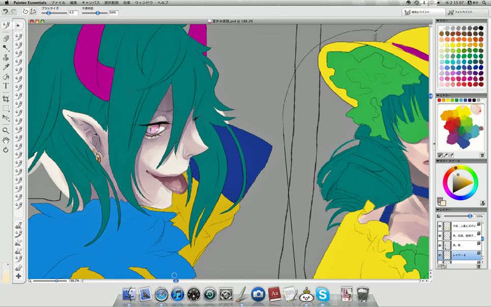 いい加減カラーパレットなるものもちゃんと活用しようと思った。肌色いちいち決めるのめんどいねん…。なにか他に効率のいい、けどしっかり塗り込んでいるように見える方法は無いだろうか。学校やすみになってから皆の絵の描き方見てないから、すっかり忘れちゃったなぁ。